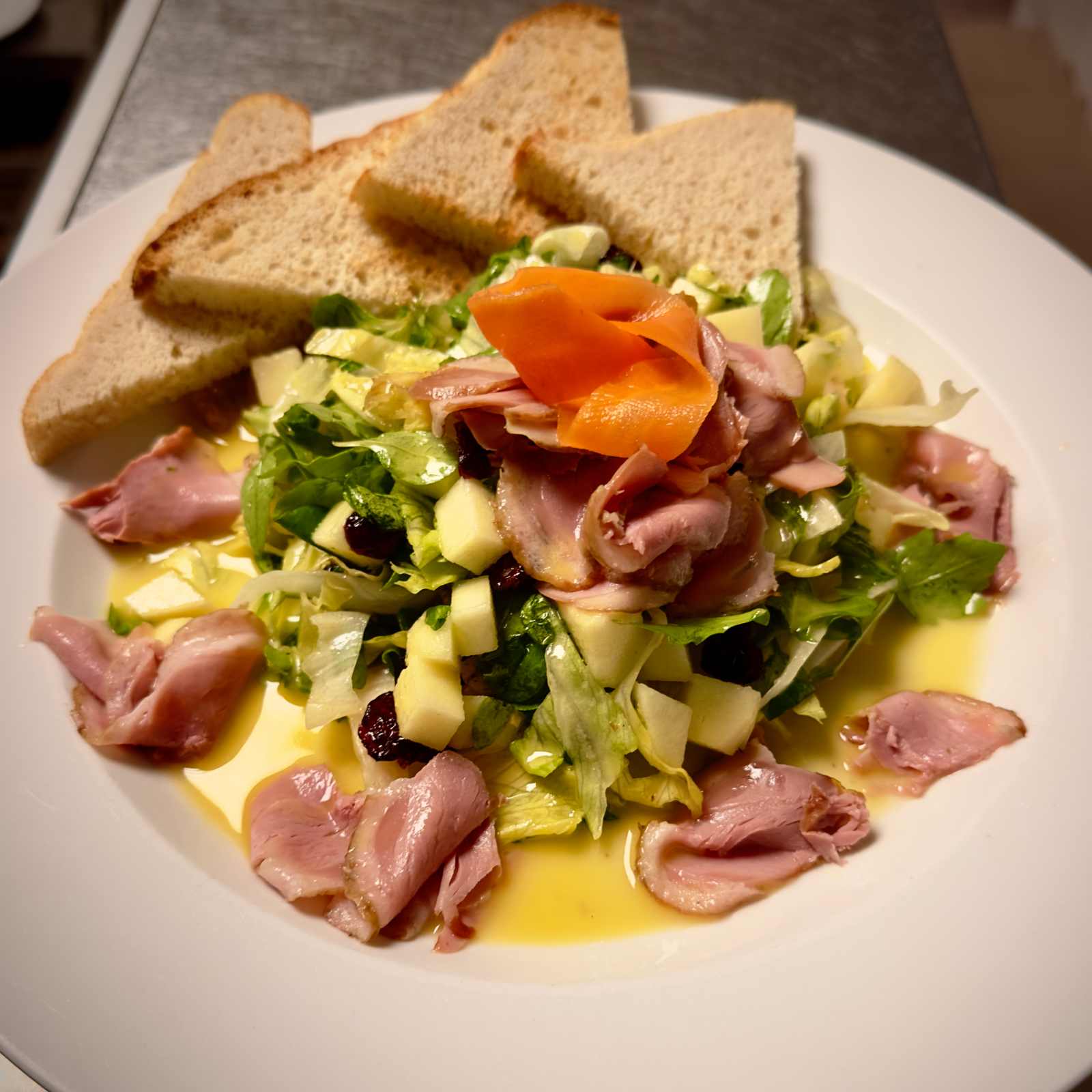 Mix listových salátů, políček, rukola, vlašské ořechy, sušené brusinky, medovo-citrónová zálivka, domácí bílý toast